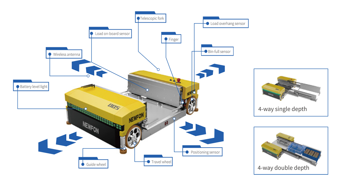 Our 4-way tote shuttle is a smart, multi-directional robot designed for high-speed storage and retrieval of totes and cartons. With the ability to move both along and across aisles, it enables dynamic routing, system scalability, and optimal space utilization—perfect for high-throughput operations in e-commerce, retail, and pharmaceuticals.