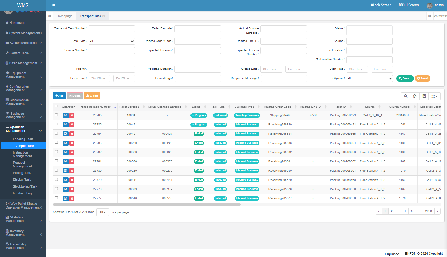 The WMS facilitates the connection of inbound and outbound operational data, task breakdown, and manages functionalities like storage position and material information control.
